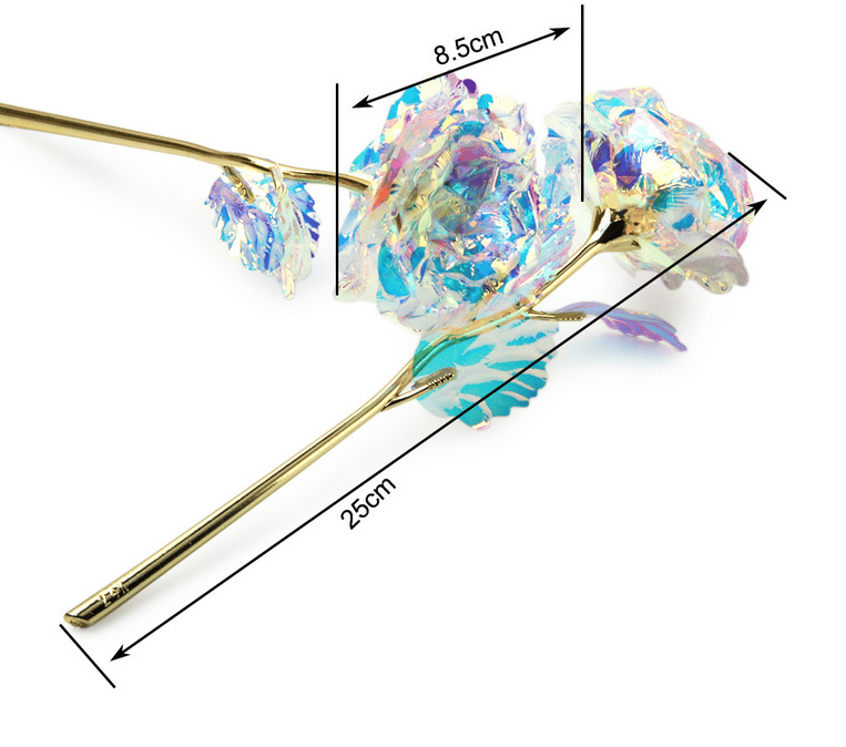 Finally, we cover them in an iridescent holographic coating to make the rose PVC stem and PVC petals sparkle in the light.